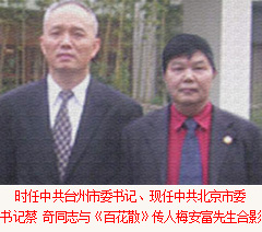 梅安富先生軍人出身(曾經(jīng)在中國(guó)馬蘭核試驗(yàn)基地工作十多年,為核武器發(fā)展做出了卓越貢獻(xiàn)、被評(píng)為八級(jí)軍殘)、高級(jí)經(jīng)濟(jì)師、中共優(yōu)秀黨員、天臺(tái)山人氏。現(xiàn)任中共鄭州臺(tái)州商會(huì)支部委員會(huì)書(shū)記、常務(wù)副會(huì)長(zhǎng)兼秘書(shū)長(zhǎng)、河南省保健品協(xié)會(huì)副會(huì)長(zhǎng)、全國(guó)政協(xié)副主席、中共中央委員、中國(guó)殘聯(lián)主席鄧樸方先生與鄭州臺(tái)州商會(huì)支部書(shū)記兼秘書(shū)長(zhǎng)、《百花散》傳人梅安富先生親切交談鄭州市腫瘤康復(fù)協(xié)會(huì)名譽(yù)會(huì)長(zhǎng)。2005年5月,作為臺(tái)州古代中醫(yī)秘方梅氏《百花散》